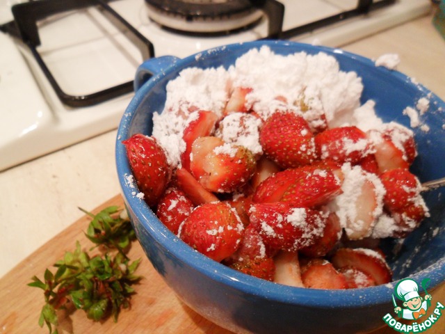 Пока корж выпекается займемся творожным кремом. 250 г клубники освободить от хвостиков, разрезать на половинки и пересыпать 50 граммами сахарной пудры.