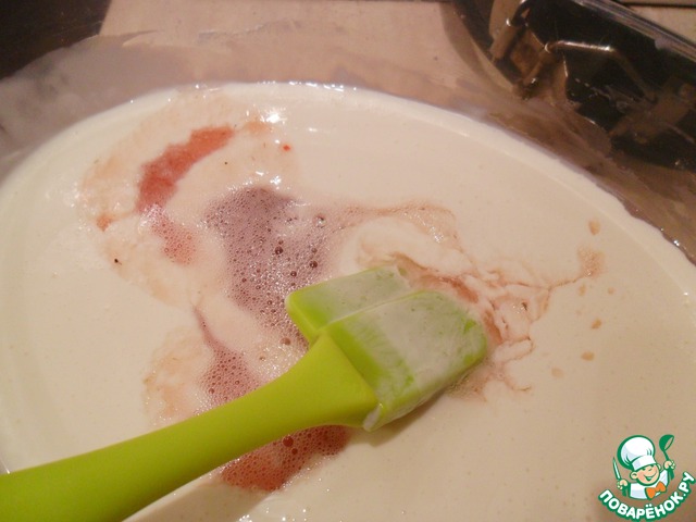 Остальную сахарную пудру соединить с творогом. Добавить в творог сок от засахаренной клубники. Приготовить по инструкции 8 г желатина (я заливаю 50 мл воды, размешиваю и подогреваю приблизительно до 60 градусов, пока он не раствориться). Желатин ввести в творог.