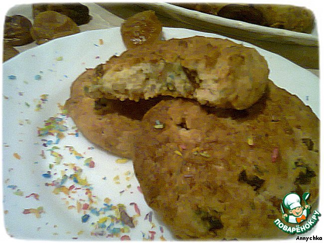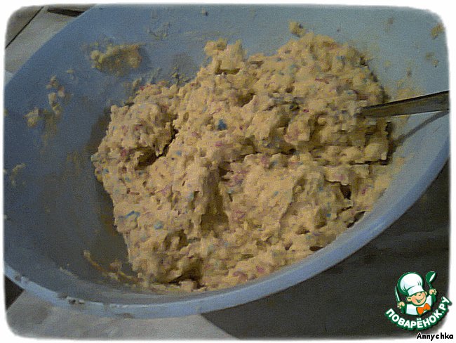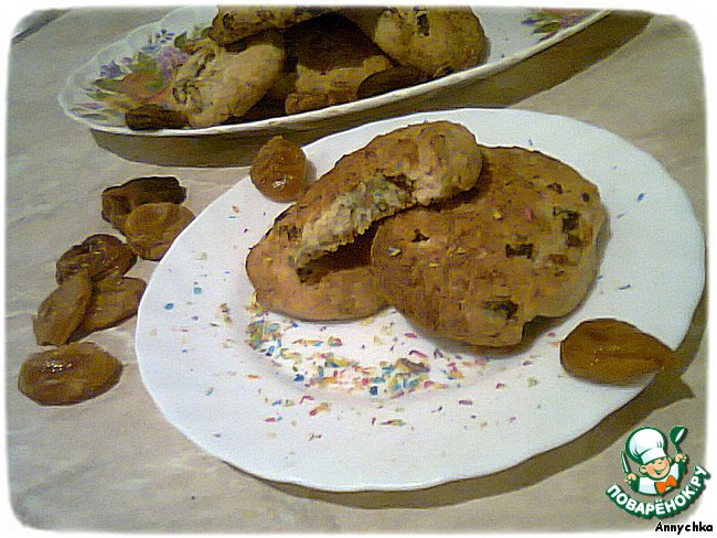 Добавить курагу (предварительно замочить водой, чтоб немного была мягкой) и остальную муку, перемешать ложкой, потом руками. Сильно месить не надо.