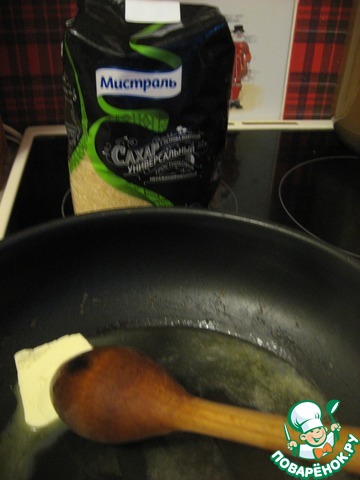 В сковороде растопим 50 гр. сливочного масла, насыпем 1/2 стакана коричневого сахара "Мистраль" и дождемся, когда сахар начнет карамелизоваться