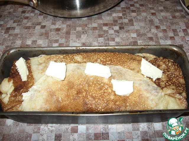 Теперь нам понадобится форма для кекса. Слегка смазываем её сливочным маслом и выстилаем её блинами так, чтобы края свешивались