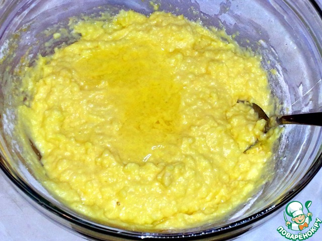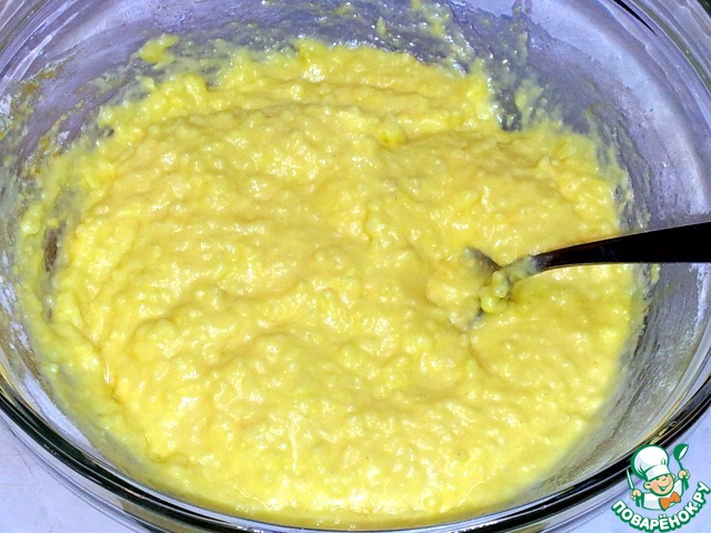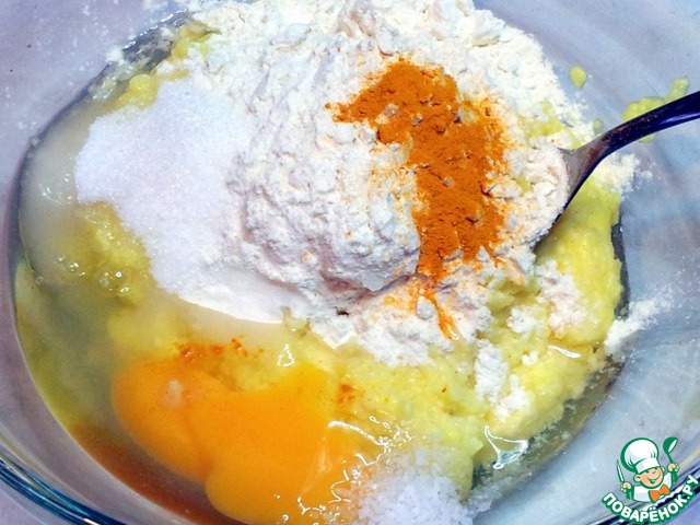 В миску с кашей просеять муку, добавить сахар, соль, разрыхлитель, куркуму, разбить яйцо.