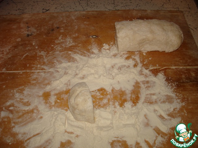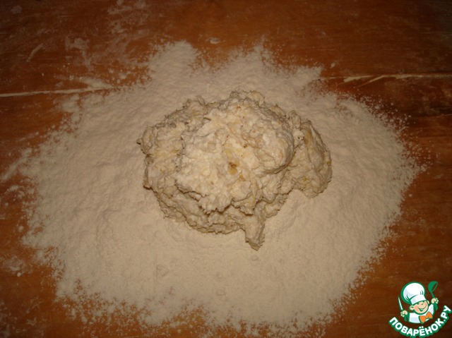 На доску просеять муку. Выложить творожную массу, обвалять её в муке и слегка вымесить. Именно слегка, не вмешивая много муки, иначе "пальчики" не будут нежными.