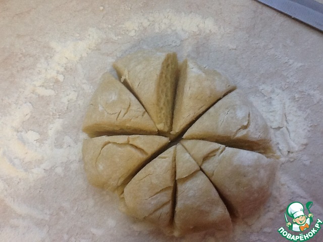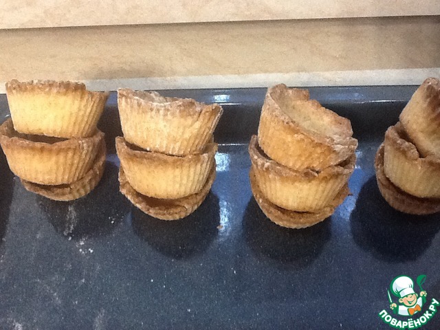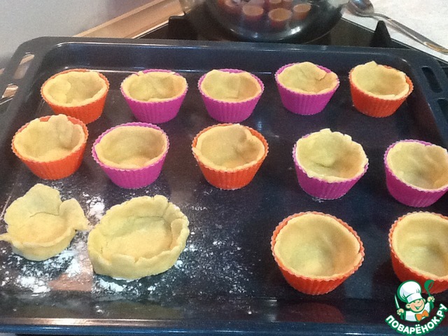 Разделить тесто на равные части. Количество определяйте сами в зависимости от того насколько большие будут у вас формы. У меня вышло 12 шт.