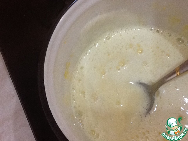 Вливаем в эту смесь горячее молоко и ставим на мелкий огонь. Постоянно помешиваем.
