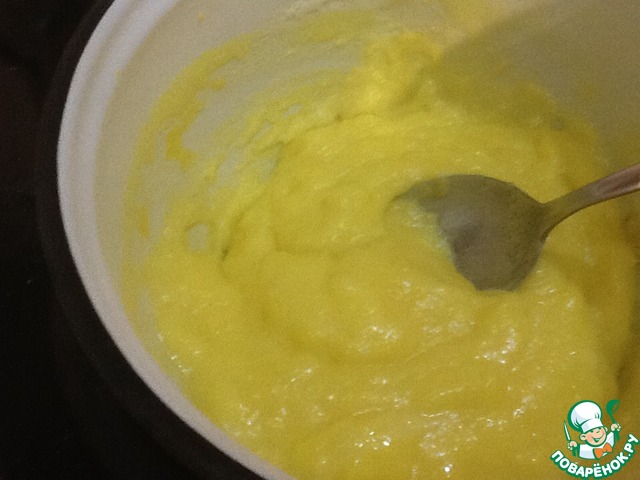 Молоко закипятить. В это время крахмал, сахар и желтки растираем до однородной массы в другой кастрюльке.