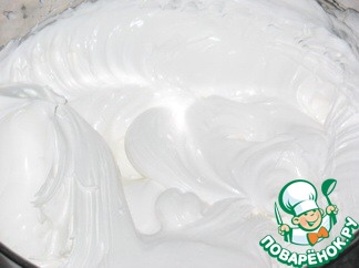 Белки и щепотку соли взбиваем миксером до загустения. Затем добавляем 2 столовые ложки сахара и взбиваем пока крем не станет совсем густой.
