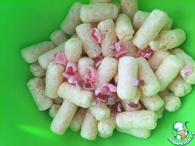Кукурузные палочки и порезанный мармелад кладем в глубокую тарелку (чтобы было удобно потом перемешивать)