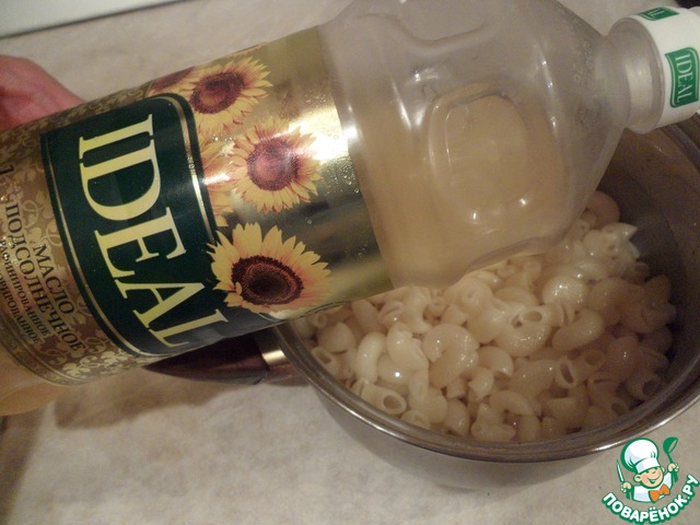 Слить кипяток, промыть в холодной воде макароны, положить в них 2 ст. л. растительного масла IDEAL и перемешать.