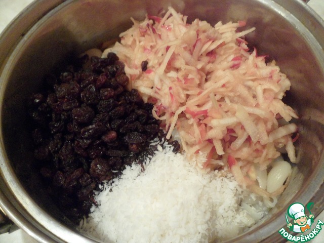 Добавить в макароны натертое на терке яблоко, изюм, сахар, ванилин и кокосовую стружку, перемешать.