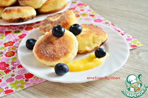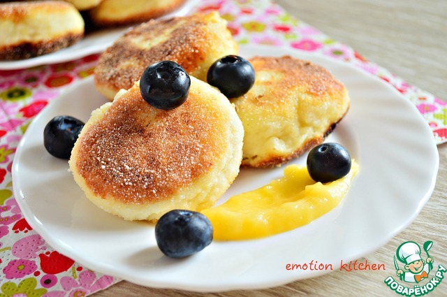 Сырники готовы, подаём со сладким соусом и ягодками. У меня лимонный курд (http://www.povareno k.ru/recipes/show/10 4762/) и голубика!