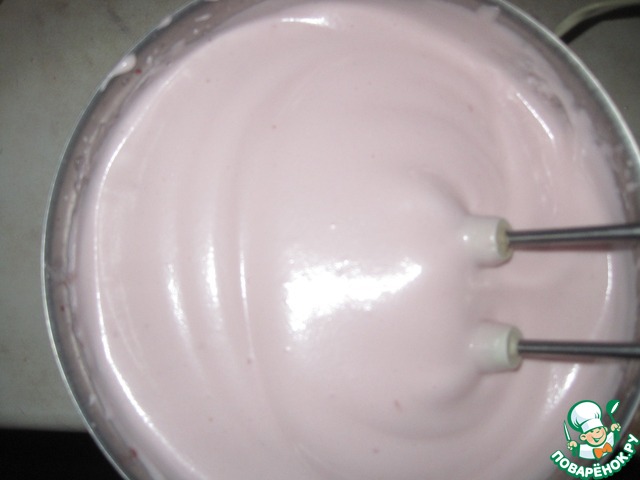 Наполняем наполовину клубничный мус. В процессе взбивания мус осветляется становисся розовым