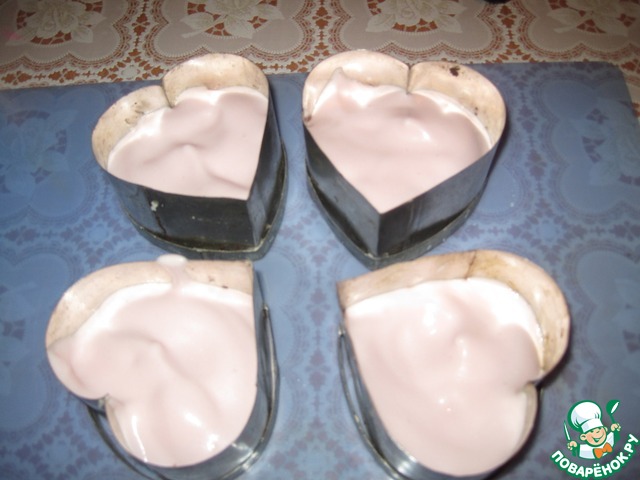 В середину кладем мус, по краям заливаем сметанным кремом (Сметану взбиваем с сахаром и добавляем растопленный желатин). Дно кулича закрываем.