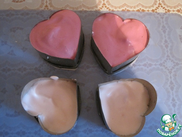 Готовим 2 вида муса. Сок ягод подогреваем, растворяем сахар и замоченный желатин. Взбиваем до образования густой пены