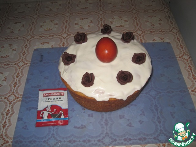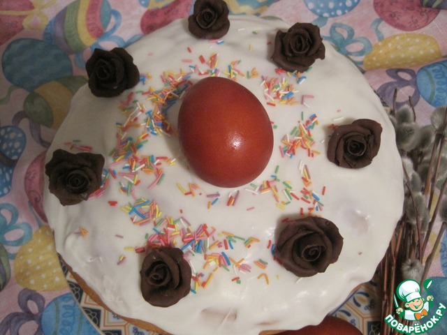 Поверхность кулича глазируем, украшаем розами из шоколада (растопленный шоколад смешиваем с медом, получается пластичная масса)