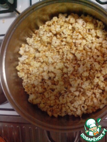 На дно большой кастрюли положить масло и сахар, когда масло начнёт издавать сливочный запах, всыпать готовый попкорн. Уменьшить огонь и постоянно перемешивать наши продукты. Если вы увидите, что наша карамель начала пригорать, смело снимите с огня, но не переставайте мешать. Через пару минут поставьте опять на огонь.