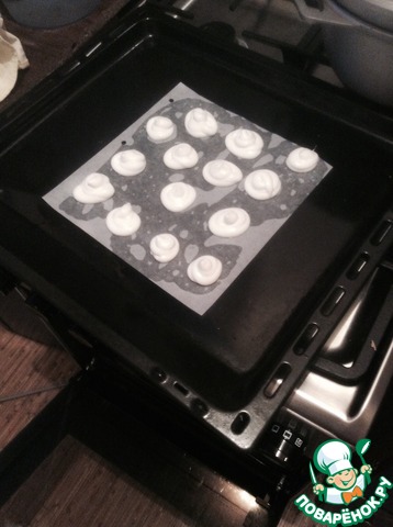 Дальше наполняем кондитерский мешок взбитыми белками, на лист стелим пергамент, а на него аккуратненькие небольшие горочки безе. Можно как на фото. Ставим в духовку, нагретую до 120 градусов примерно на час ( смотрите по готовности) больше температуру не ставьте, т. к безе должны сушиться в духовке