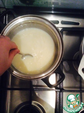 Займемся кремом для торта. Молоко выливаем в кастрюльку и нагреваем, когда оно закипятится, всыпаем сахар, помешивая. Яйца с мукой в отдельной чашке взбиваем блендером. В муку с яйцами вливаем половину молока, перемешиваем. Соединяем с оставшимся молоком, не забывая помешивать, чтобы не подгорело. Доводим до кипения, но не кипятим! Крем сам загустеет у вас на глазах