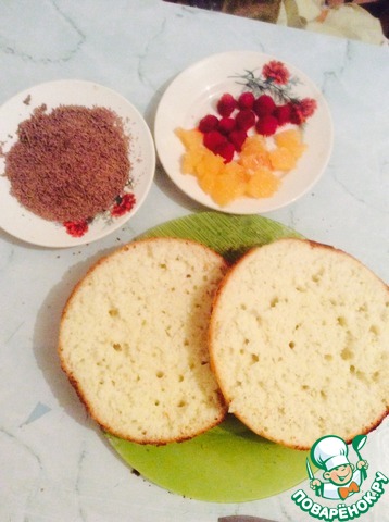 Пока остужается крем, успеем разрезать бисквит на две части и подготовить начинку и украшения. Бисквит я разрезала обычным ножом, так как диаметр не большой. Моя мама всегда резала нитью. В качестве украшения я выбрала шоколад ( его я заранее натерла мелко на терке), малину, апельсин и кокосовую стружку