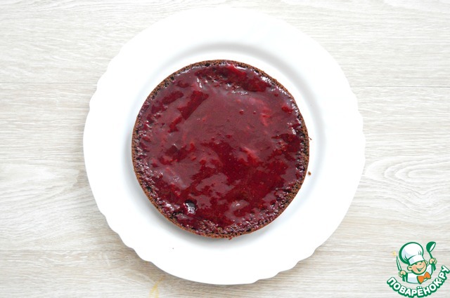 Готовим малиновый крем. Высыпаем в кастрюлю замороженную малину. Даём немного оттаять и ставим на плиту. Засыпаем сахаром (5 ложек). Варим на умеренном огне. Остужаем и протираем через сито. Полученным кремом пропитываем нижний корж, и небольшим количеством верхний.
