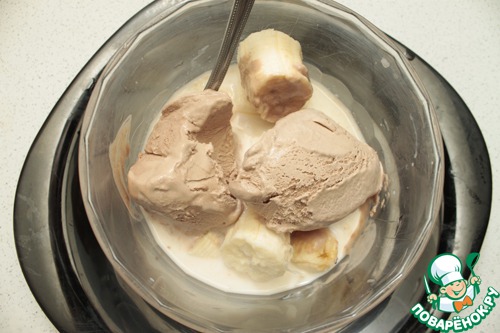 Можно добавить банан. При помощи блендера взбить молоко, шоколадное мороженое до получения однородной массы.