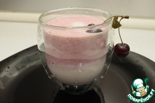 Полученную смесь для молочного коктейля следует взбить при помощи блендера и разлить по бокалам. Сверху каждый бокал следует украсить свежими ягодами вишни и подавать на стол!