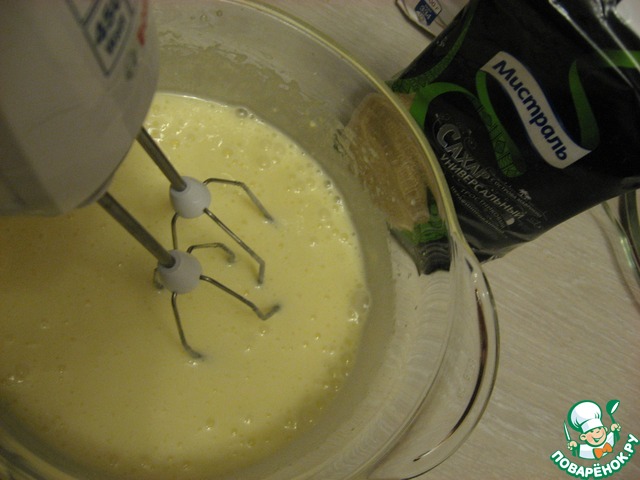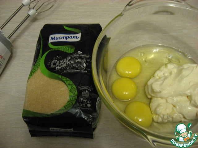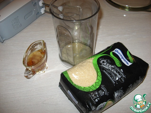 Итак взбиваем миксером 2 яйца, 1 желток, майонез и сахар коричневый "Мистраль"