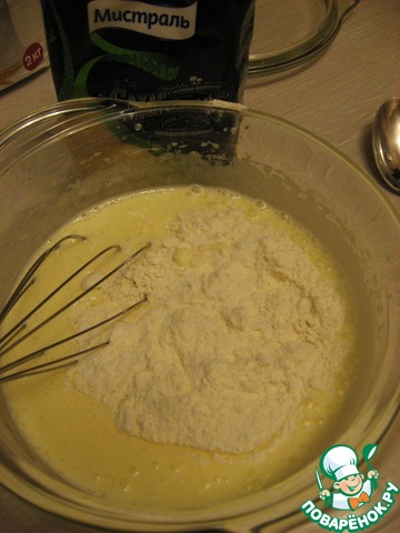 Теперь добавляем муку, смешанную с содой. Гасить соду не нужно, так как в майонезе есть достаточное количество кислоты для реакции. Вымешиваем аккуратно лопаточкой до гладкости