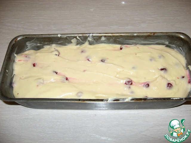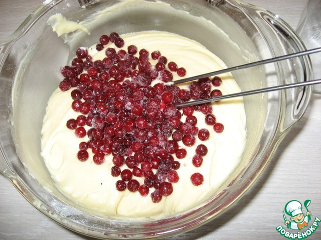 Всыпаем бруснику и перемешиваем. Немного брусники можно оставить на украшение кекса