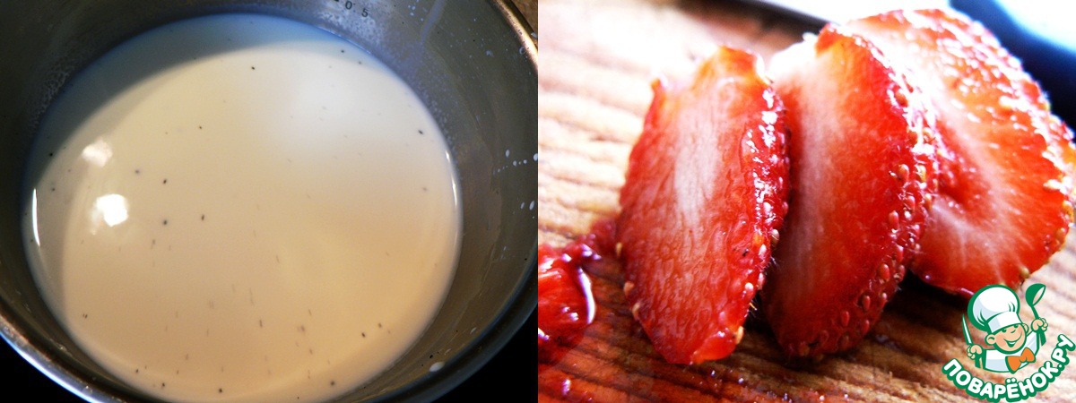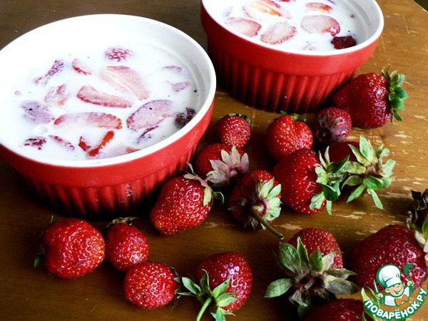 -Клубнику нарезать на небольшие кусочки, залить молоком.