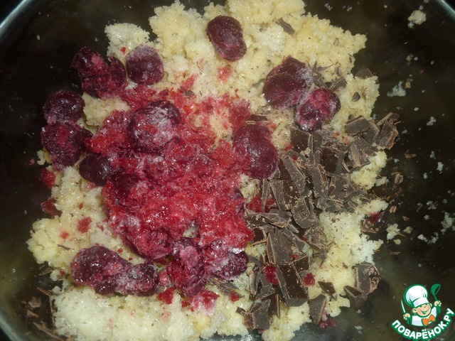 Далее кладем мелко порубленный шоколад, вишню и ванилин.