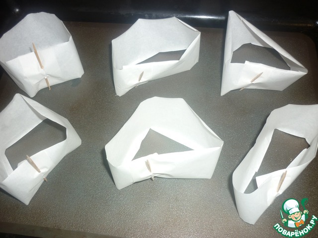 Бумагу для выпечки нарезаем полосками сантиметров в 5, делаем из нее формочки для печенья. Я воспользовалась зубочистками.
