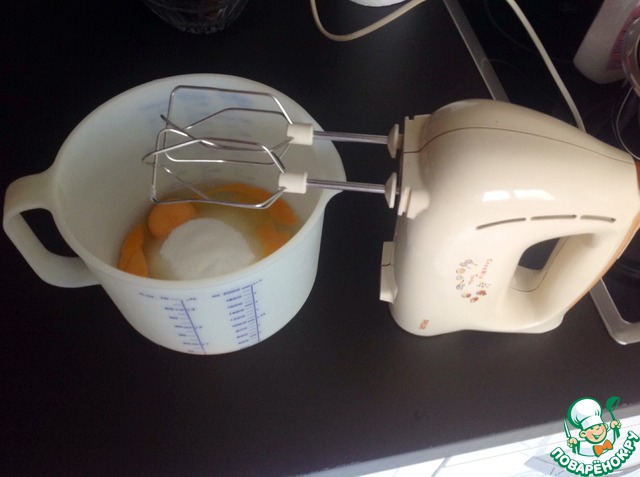 Яйцо взбиваем вместе с сахаром до получения густой массы.