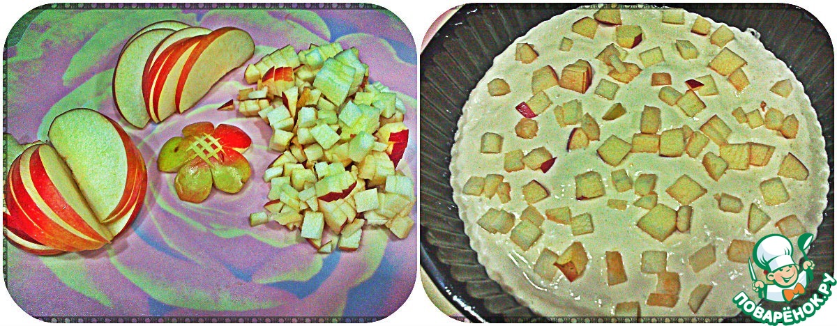 Теперь подготовим яблоки. Если кожура не толстая, то можно ее и не очищать. Часть яблок я порезала мелкими кубиками, а часть дольками тоненькими. Так же сделала еще цветочек для центра пирога, решила поэкспериментировать. Не люблю шарлотку с большим кол-вом яблок, поэтому кубики я ложу в нижнюю часть пирога, а дольками украшаю верх. В смазанную маслом форму выложить 1/3 часть теста и присыпать кубиками яблок. Чтоб яблоки не осели на дно, нужно их предварительно присыпать мукой.