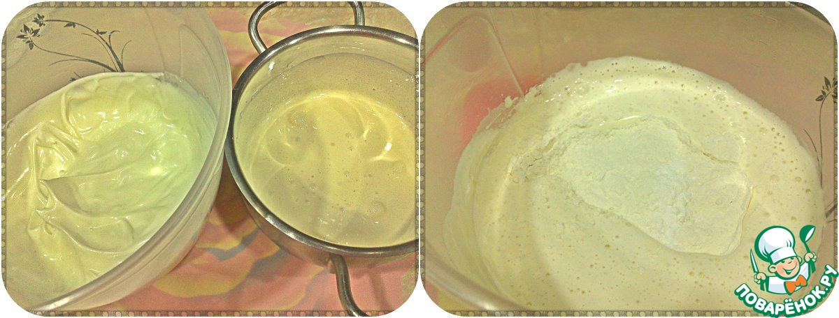 Посмотрите на левой фотографии видно до какого состояния нужно взбивать белки (я специально ложкой вверх приподняла массу). Желтки (комнатной температуры) с сахаром взбивать минуты 4 до увеличения в объеме в 2 раза и добавить к белкам. Все это тщательно взбивать еще минуты 3-4, затем добавить просеянную муку, ванилин (по желанию и вкусу, я добавила щепотку для аромата) и перемешать ЛОЖКОЙ. Не рекомендую взбивать миксером, так как потеряем воздушную структуру наших тщательно взбитых белков и пирог в итоге будет не воздушный. Мешать муку необходимо очень аккуратно, мешая снизу вверх, пока тесто не вберет в себя полностью муку.
