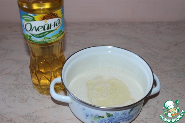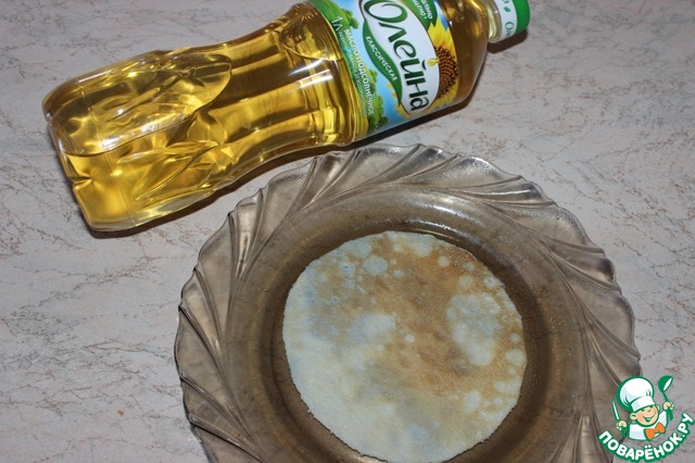 Молоко, яйца, соль, сахар смешиваем, взбиваем блендером, затем постепенно всыпая муку готовим жидкое блинное тесто. В конце добавляем немного растительного масла.