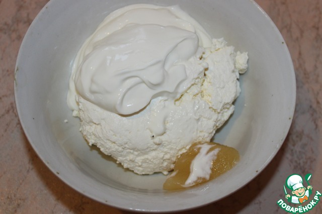 Для начинки творог, йогурт, мед смешиваем и взбиваем блендером