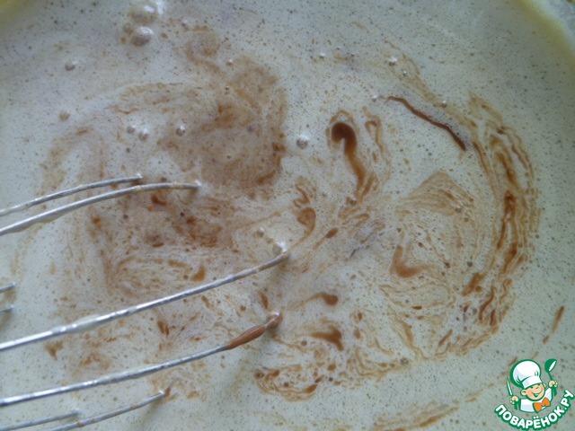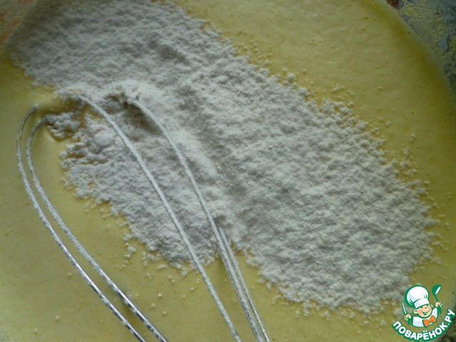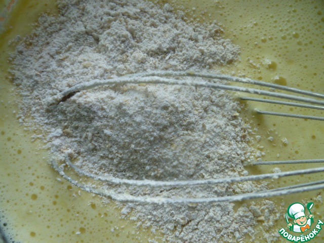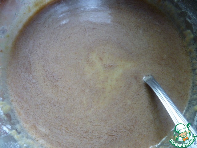 Затем добавить просеянную пшеничную муку смешанную с содой.