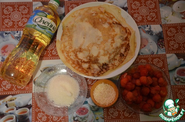Приготовить блины по любимому рецепту. У меня блины на сыворотке с добавлением подсолнечного масла "Олейна". Клубнику тщательно промыть, в моём случае разморозить (за окном зима, но морозильная камера даёт возможность и в холодное время года побаловать себя вкусными домашними ягодами).