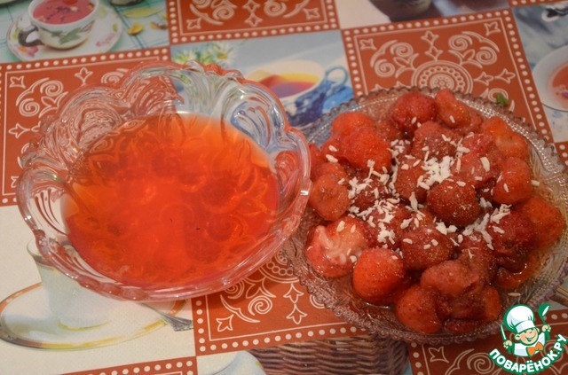 А пока приготовим кисель. Из клубники отжимаем сок. Из 700 гр ягод получается около 300 гр. сока. Ставим сок на медленный огонь, разводим в стакане воды крахмал и сахар. Когда сок нагреется тонкой струйкой вливаем разведённый крахмал, постоянно помешиваем. Как только сок закипит выключаем и остужаем.