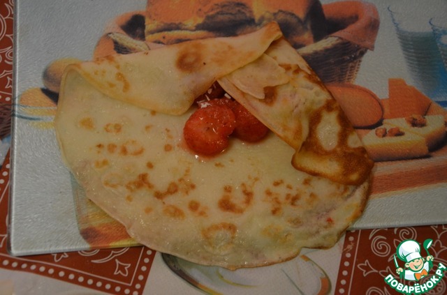 Блинчики нужно свернуть таким образом, чтобы даже если из клубники будет подтекать сок, то он бы оставался внутри. Я делаю такие блинчики "конвертиком".