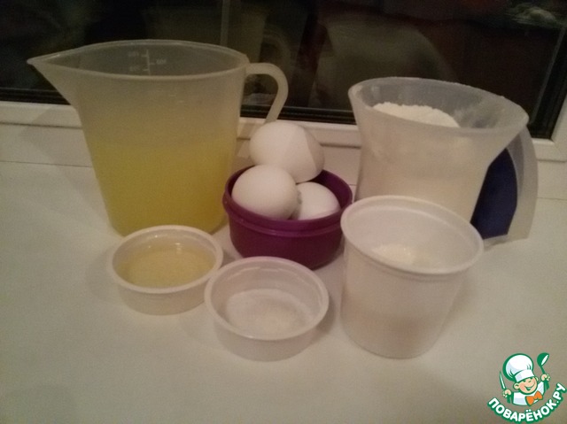 микроволновку. Сыворотка должна стать теплой. Тем временем соль, сахар, яйца выливаем в большую миску и взбиваем венчиком до появления пены. К смеси добавляем сыворотку и еще немного взбиваем. Далее понемногу высыпаем муку и перемешиваем не останавливаясь. В итоге получается однородная масса похожая на густой кефир. Выливаем подсолнечное масло и аккуратно помешиваем. Даем тесту отдохнуть 20-30 минут. Накаляем сковороду для жарки и обмазываем небольшим кусочком сливочного масла. Обжариваем с 2-х сторон.