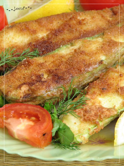 Кабачки или цукини режем вдоль на пластинки толщиной около 4 мм. Обильно посыпаем их солью и оставляем на 15 минут, чтобы они выпустили лишнюю влагу. Спустя указанное время жидкость слить, а кабачки промыть под проточной водой от лишней соли. Каждую пластинку обмазываем с внутренней стороны специями и пряными травами. На одну половинку укладываем порезанный пластинками сыр, закрываем второй половинкой. Сэндвичи поочередно обмакиваем (со всех сторон, включая бока!) сначала в муку, затем во слегка взбитые яйца, и, наконец, в сухари.