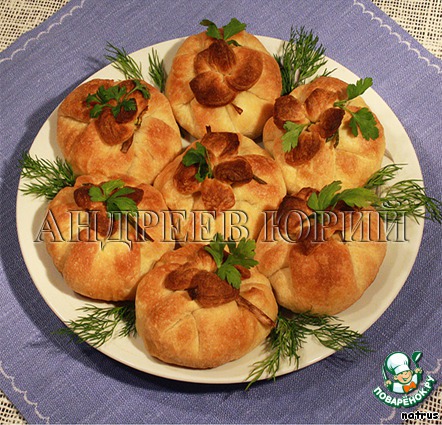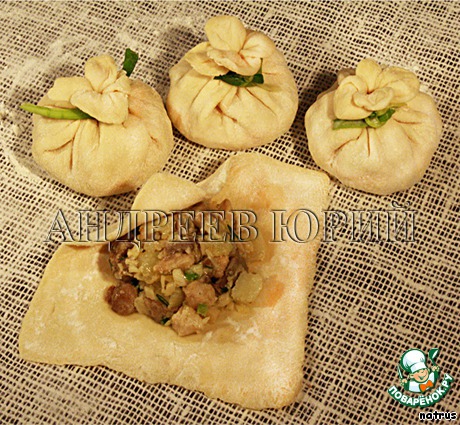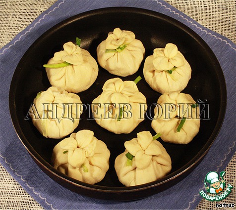 На каждый приготовленный квадрат из теста выложить начинку, соединить края квадрата в узелок и перевязать перышком лука, краешки развернуть как цветок.