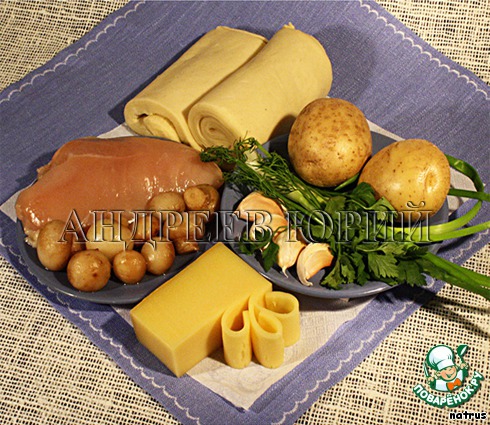 В одной чашке соединяем вместе: зелень, чеснок, сыр, картофель, грибы с куриным филе, заправляем майонезом и солью с перцем, всё хорошенько перемешаем. Наша начинка готова!