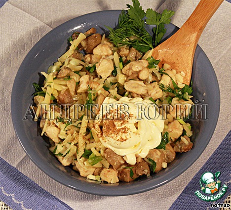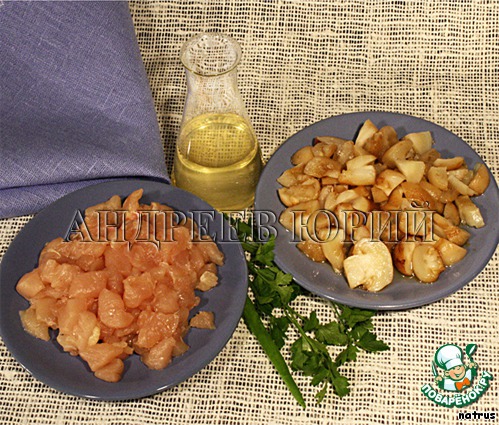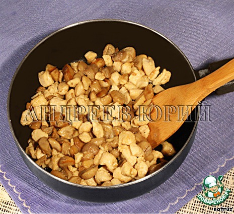 ПО ОТДЕЛЬНОСТИ обжариваем на растительном масле грибы и филе до золотистого цвета, затем соединяем вместе и даем остыть.