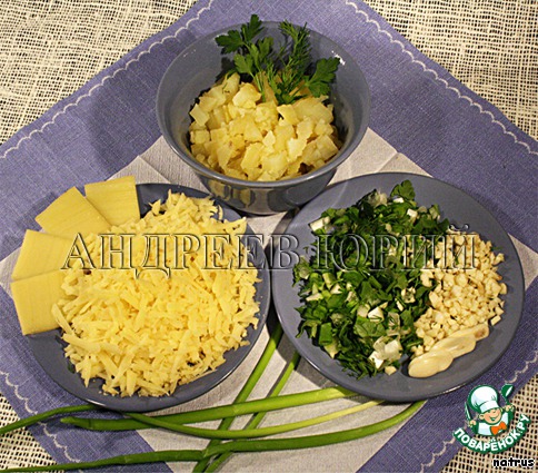 Остывший картофель очищаем и нарезаем мелкими кубиками, сыр натираем на мелкой терке, чеснок и зелень мелко нарубить, оставить несколько длинных перьев лука.