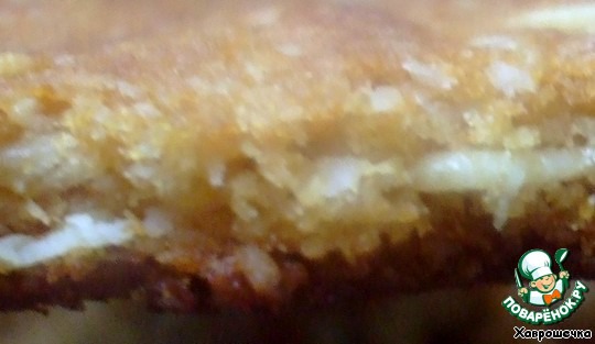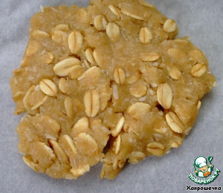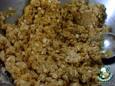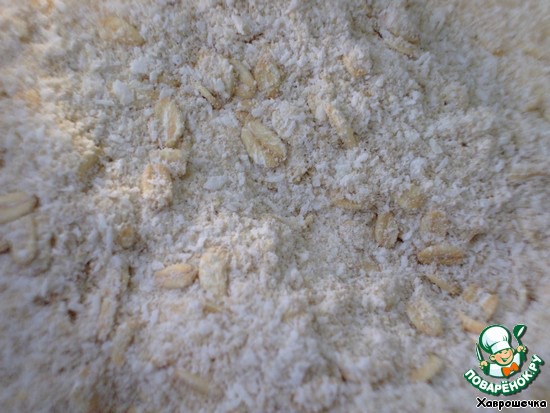 Теперь мы эту пенистую субстанцию добавляем в смесь муки, сахара, овсяных хлопьев и кокосовой стружки. Перемешиваем. Должно получиться так: маслянистая масса, которую трудно было бы месить из-за ее неоднородной структуры. Но... нам и не надо!