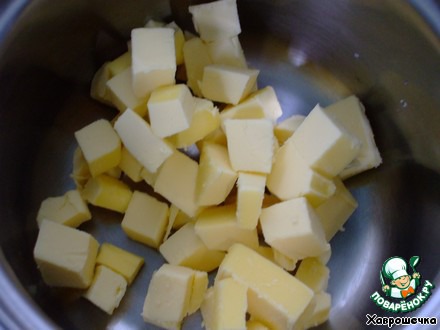 Нарезать масло кубиками, поместить в небольшую кастрюльку и поставить на маленький огонь растапливаться.