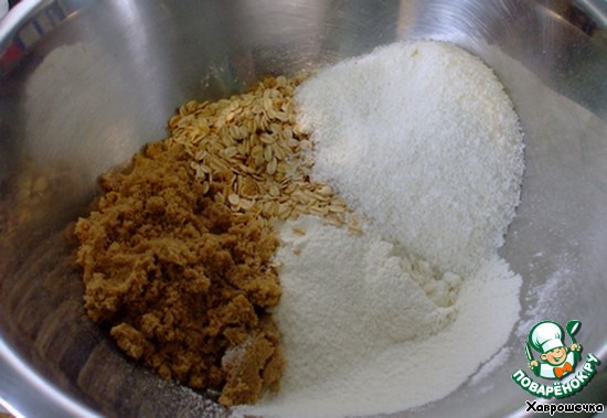 Добавить в просеянную муку овсяные хлопья, коричневый сахар, кокосовую стружку.